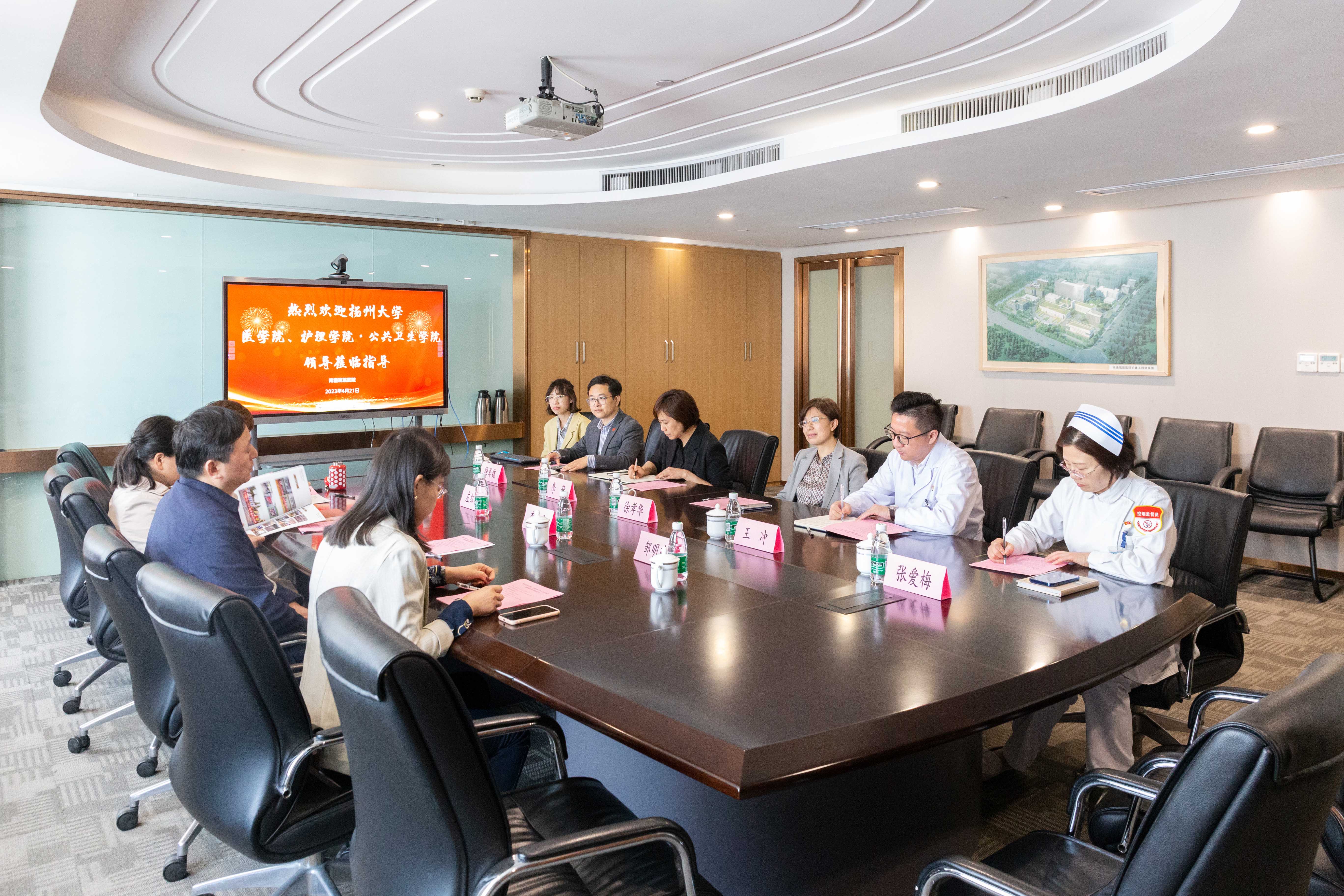 4月21日上午,揚州大學(xué)醫(yī)學(xué)院、護理學(xué)院·公共衛(wèi)生學(xué)院與南通瑞慈醫(yī)院交流會在南通瑞慈醫(yī)院舉行。揚州大學(xué)醫(yī)學(xué)院副院長李偉、副書記左紅梅、護理學(xué)院·公共衛(wèi)生學(xué)院黨委副書記鄒明瑋、揚州大學(xué)醫(yī)學(xué)院團委書記許金鑫一行來我院座談交流,瑞慈醫(yī)院院長徐孝華、副院長李慧、副院長王沖、科教部主任徐季魏、護理部主任張愛梅參加交流。