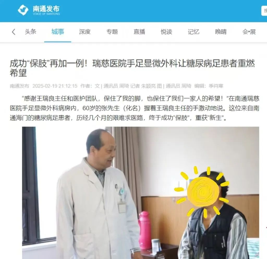 "感謝王瑞良主任和醫(yī)護團隊,保住了我的腳,也保住了我們一家人的希望!"在南通瑞慈醫(yī)院手足顯微外科病房內(nèi),60歲的張先生(化名)握著王瑞良主任的手激動地說。這位來自南通海門的糖尿病足患者,歷經(jīng)幾個月的艱難求醫(yī)路,終于成功“保肢”,重獲“新生”。