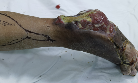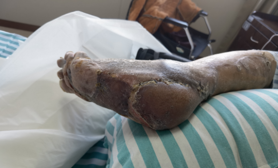 據(jù)家屬介紹,張先生患糖尿病多年,因疏于血糖管理,半年前腳底出現(xiàn)破潰。夫妻二人起初未予重視,僅自行用雙氧水、碘伏處理。隨著潰爛范圍不斷擴大,腳底逐漸形成直徑約5厘米的"黑洞",在多家醫(yī)院治療未見好轉(zhuǎn)。眼見病情惡化至面臨截肢風險,絕望之際慕名來到王瑞良主任這里求診。
