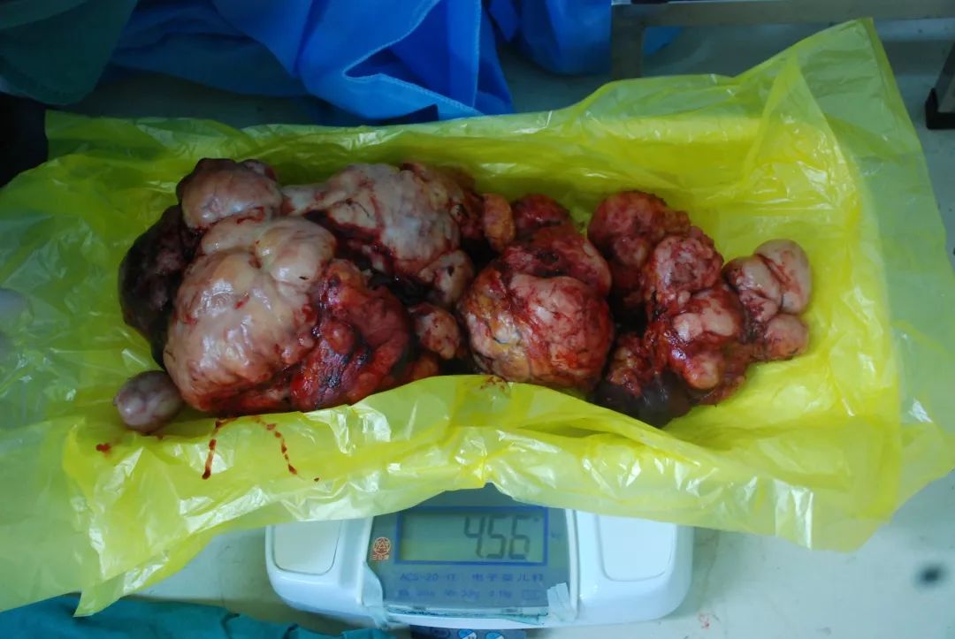 取下來的三個(gè)脂肪瘤重達(dá)9斤,要知道,一個(gè)剛出生的嬰兒也不過6、7斤重。鄭起教授表示,腹膜后脂肪肉瘤是一種相對(duì)比較少見的惡性腫瘤,早期無典型癥狀,患者通常以腹部包塊為主要表現(xiàn),因腹膜后位置隱蔽,潛在腔隙較大,故早期診斷困難,大多數(shù)腫瘤患者就診時(shí)腫瘤已相當(dāng)巨大。因此,當(dāng)發(fā)現(xiàn)身體有異常腫塊、隆起時(shí),不能誤以為是“發(fā)?!?,一定要到正規(guī)醫(yī)院排查,消除隱患。