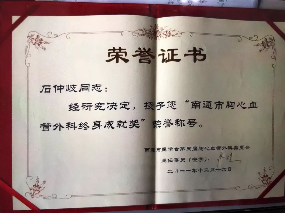 石老1963年參加工作,到今年已經(jīng)是第56個年頭,他將畢生精力傾注于胸心外科,從醫(yī)療、教學到科研,碩果累累,開展多項高精尖、高難度、高風險手術(shù),培養(yǎng)出了許許多多的胸心外科醫(yī)療人才,2011年獲南通市胸心血管外科終身成就獎。