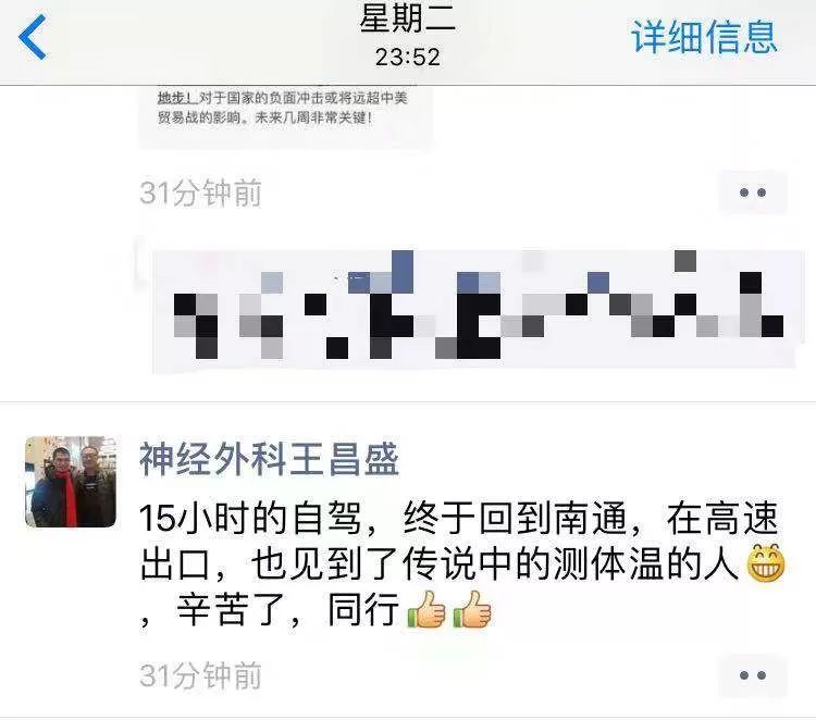 就在開診前一天臨近半夜時,神經外科主任王昌盛更新了一條朋友圈。老家河北承德的他,本來已經預訂了回南通的機票,但是一想到機場人多,自己又是這樣特殊的職業(yè),萬一感染上新冠病毒后果不堪設想,把機票給退了。掛念科里的工作,他最終選擇一個人自駕15個小時回南通上班。