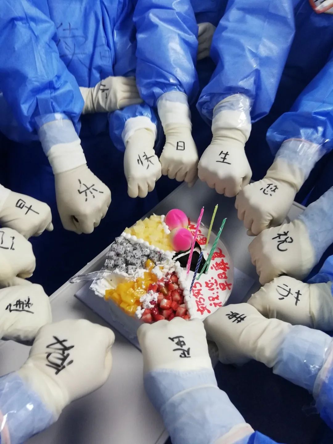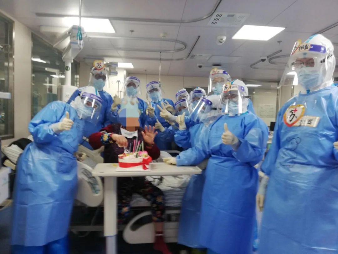 3 月 7 日 18 點,交接班時,江蘇、黃石兩地醫(yī)護人員為老人送上了一份驚喜,準備了蛋糕和蠟燭,為老人唱起生日歌,當大家一下子都圍在張奶奶面前時,老人驚呆了,開心地眼淚都要落下來,現(xiàn)場氣氛十分暖心。