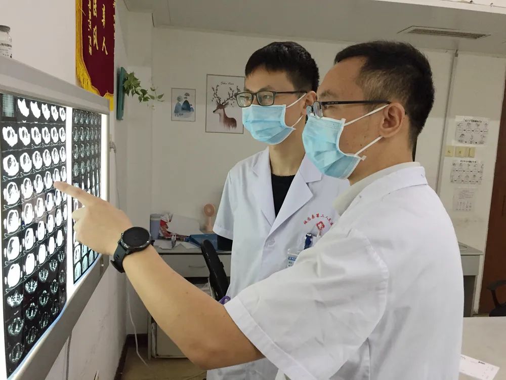 △圖為:我院呼吸內(nèi)科醫(yī)生孟醒與城固縣第二人民醫(yī)院呼吸內(nèi)科醫(yī)生孟天罡討論患者病情。