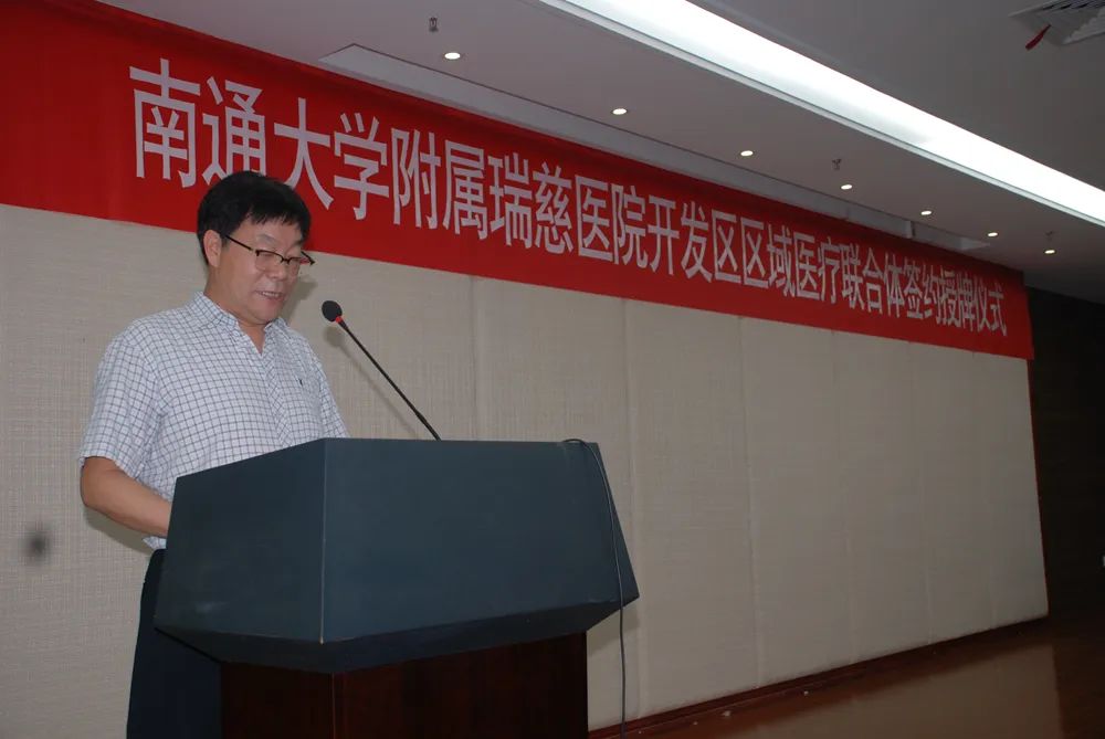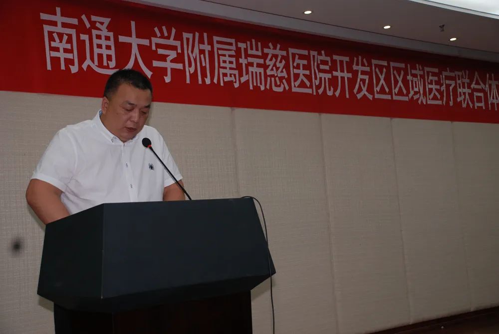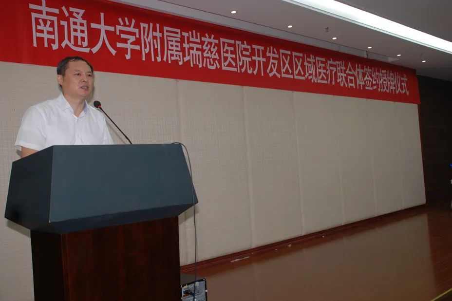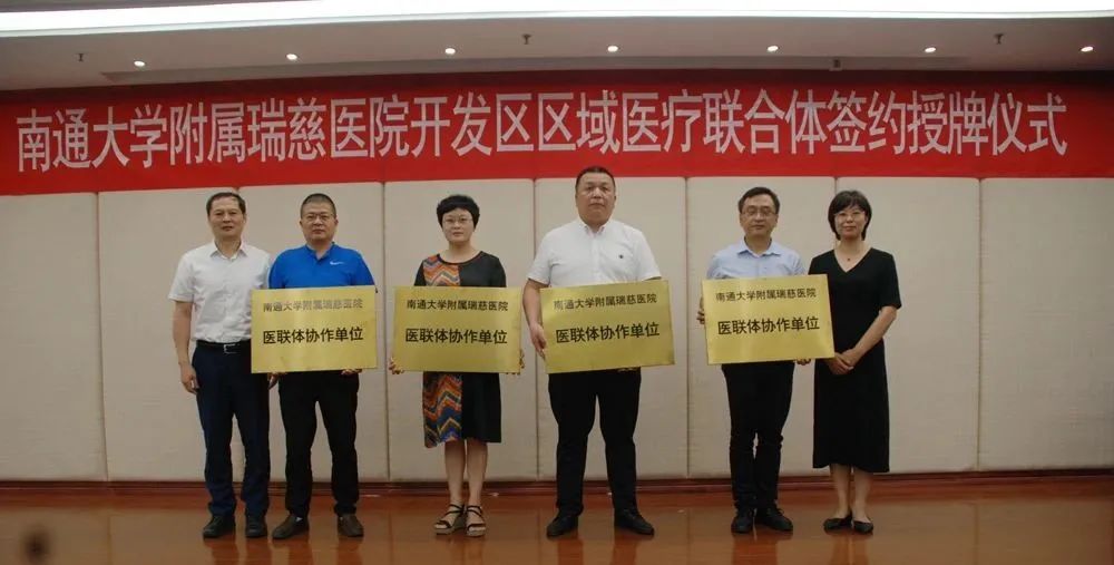 7月8日下午,南通大學(xué)附屬瑞慈醫(yī)院與開發(fā)區(qū)4家社區(qū)衛(wèi)生服務(wù)中心組建醫(yī)療聯(lián)合體簽約授牌儀式隆重舉行。南通市開發(fā)區(qū)管委會副主任劉鋒,社會事業(yè)局局長邵平、副局長黃裕若,開發(fā)區(qū)中興、小海、新開、竹行街道衛(wèi)生服務(wù)中心主任等領(lǐng)導(dǎo)及嘉賓出席了儀式。