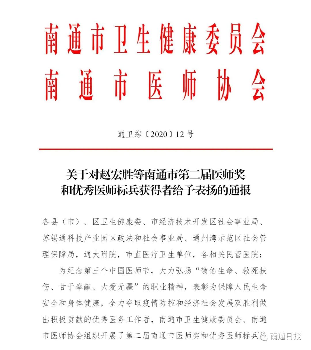 從醫(yī)近20年來(lái),他堅(jiān)守“醫(yī)乃仁術(shù),人命至重,普同一等,一心赴救”的人生格言,廉潔行醫(yī)、始終如一,深受患者愛(ài)戴和同行敬重。先后被評(píng)為南通市衛(wèi)生系統(tǒng)百佳醫(yī)生、南通市開(kāi)發(fā)區(qū)優(yōu)秀共產(chǎn)黨員、南通市“十三五”科教強(qiáng)衛(wèi)工程青年醫(yī)學(xué)重點(diǎn)人才。