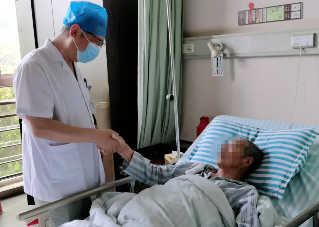 圖為:出院當(dāng)天查房時,張老伯激動地握著胸外科主任曹飛的手,一個勁兒地表示感謝。