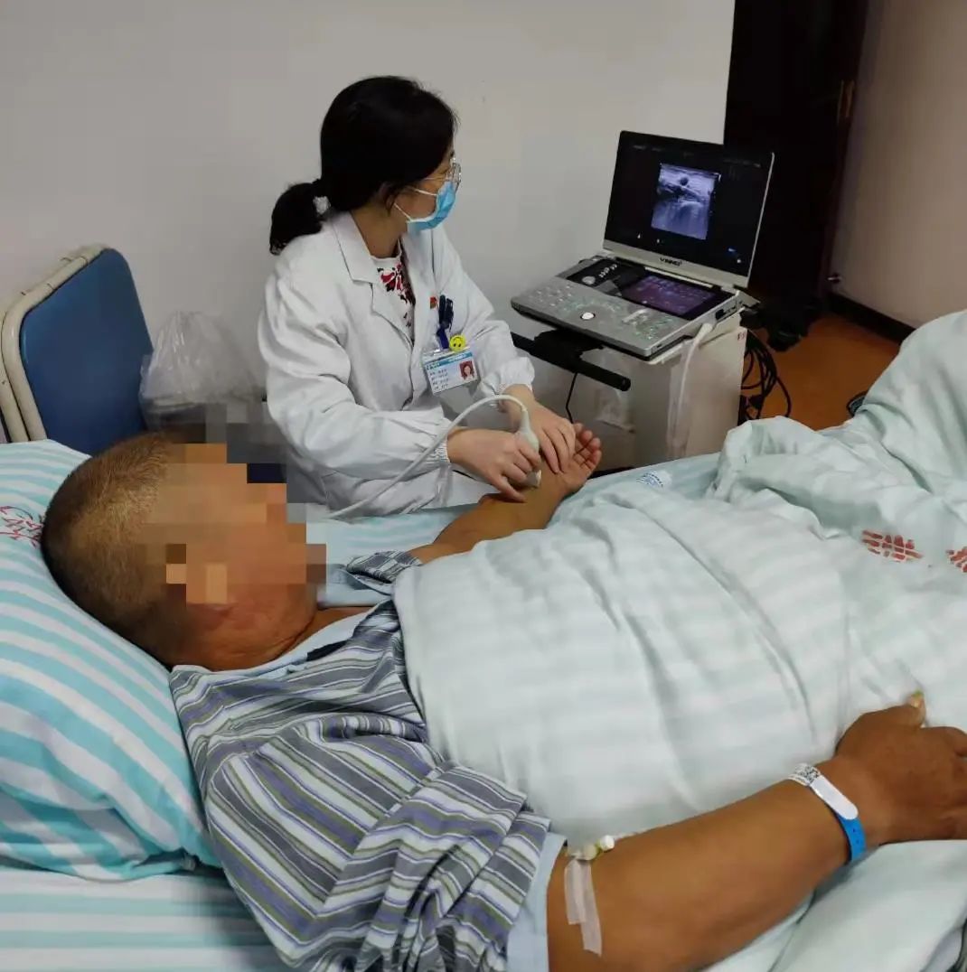 手術(shù)后第二天,秦主任在病床邊為孫師傅用彩超再次評(píng)估