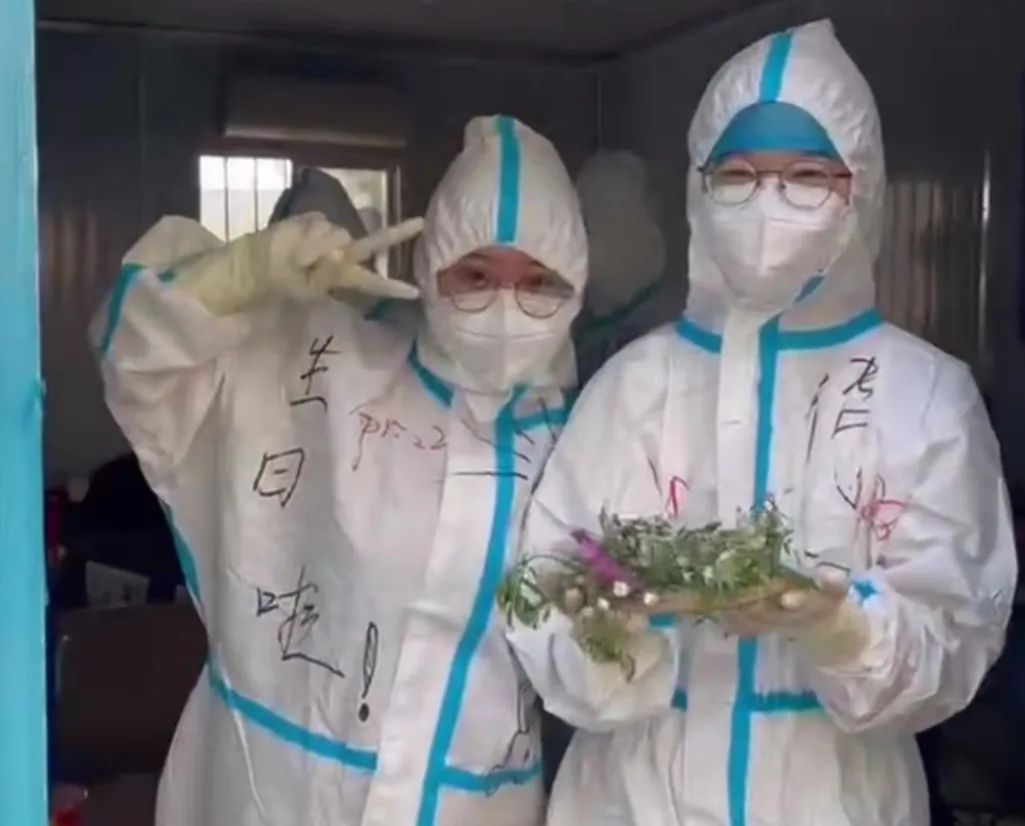 而最讓她感動的是,在這樣艱苦而忙碌的條件下,大家為了給她制造浪漫,營造儀式感,花了很多心思。醫(yī)生張洪煒和隔離點唯一的男護朱澤鵬前一天中午休息時特意在隔離點的草地里搜羅了野花,給她編了頂花環(huán)。為了照顧她這個壽星,大家主動分擔工作,“強迫”她休息一天。院領導、同事們和家人特意錄制短視頻,為她送上生日“云祝?!?。