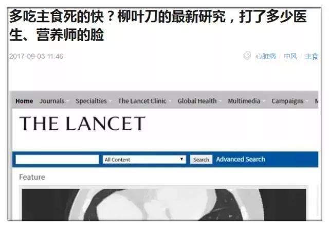 近日,一篇文章在朋友圈瘋傳,引用發(fā)表在著名醫(yī)學(xué)期刊《柳葉刀》上的一項(xiàng)研究,聲稱“多吃主食死得更早”等。
