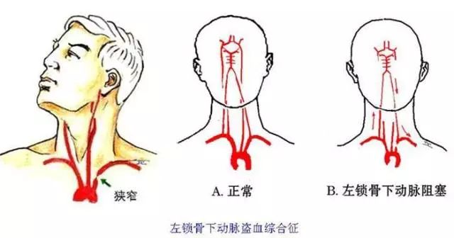 左側(cè)鎖骨下動(dòng)脈狹窄,血流不暢,會(huì)導(dǎo)致壓力變小,產(chǎn)生流體力學(xué)上的“虹吸”效應(yīng),即左側(cè)鎖骨下動(dòng)脈不僅沒有向上給頭部供血,反而會(huì)引起其他血管供應(yīng)給腦部的血液發(fā)生逆流,即流進(jìn)左臂。通俗地講,這根狹窄的血管像油耗子一樣,悄無聲息地把本應(yīng)供給腦部的血吸進(jìn)了胳膊里,才導(dǎo)致楊先生腦供血不足。