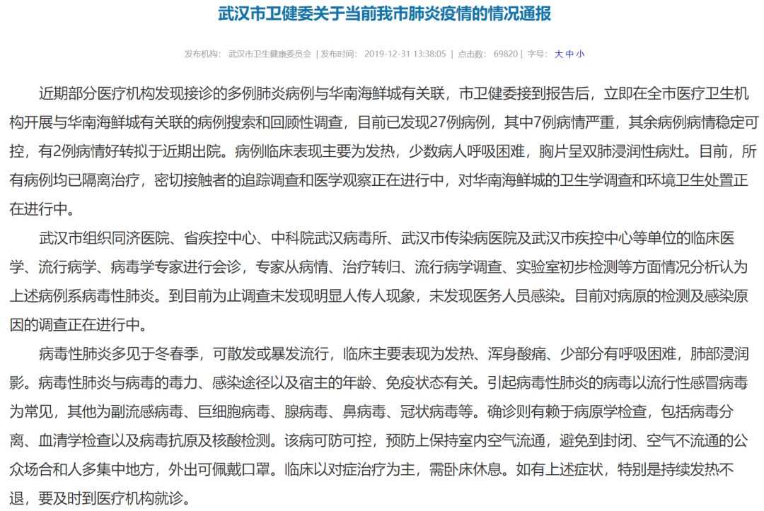 2019年12月31日,武漢衛(wèi)健委再次發(fā)布《關(guān)于當(dāng)前我市肺炎疫情的情況通報》通報中顯示,目前已發(fā)現(xiàn)27例病例,其中7例病情嚴(yán)重,其余病例病情穩(wěn)定可控,有2例病情好轉(zhuǎn)擬于近期出院。
