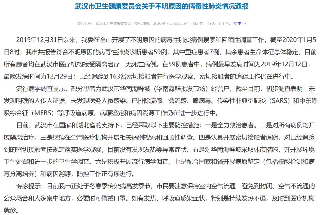 2020年1月5日,武漢衛(wèi)健委再發(fā)通報,截至5日8時,共報告符合不明原因的病毒性肺炎診斷患者59例,其中重癥患者7例,其余患者生命體征總體穩(wěn)定,目前所有患者均在武漢市醫(yī)療機構(gòu)接受隔離治療,無死亡病例。初步調(diào)查表明,未發(fā)現(xiàn)明確的人傳人證據(jù),未發(fā)現(xiàn)醫(yī)務(wù)人員感染。已排除流感、禽流感、腺病毒、傳染性非典型肺炎(SARS)和中東呼吸綜合征(MERS)等呼吸道病原。病因溯源工作仍在進(jìn)一步進(jìn)行中。