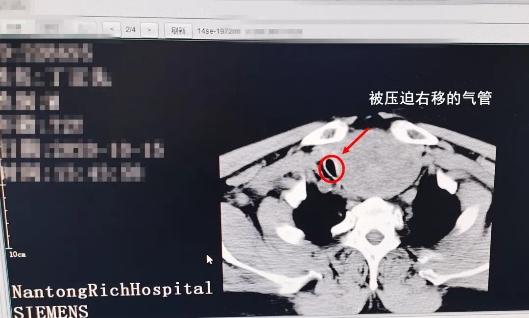 讓丁爺爺沒想到的是,他的病情遠非氣管炎這么簡單。在當?shù)蒯t(yī)院檢查后,醫(yī)生發(fā)現(xiàn),丁爺爺?shù)牟弊幼筮呴L了個大腫塊,正是這個巨大的腫塊將丁爺爺?shù)臍夤軘D壓變形,發(fā)生了右移,所以才會出現(xiàn)呼吸困難的癥狀。之后丁爺爺被診斷為胸骨后巨大甲狀腺腫瘤,高度懷疑惡性。