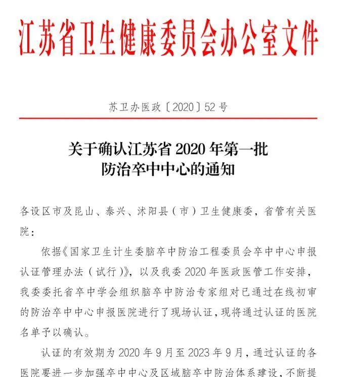 我院于2018年初啟動卒中中心創(chuàng)建工作,于2018底,成為南通市腦卒中急救地圖首批成員單位,2020年9月通過國家腦防委卒中防治中心認證。卒中中心支柱科室神經內科,為南通市重點建設??啤?/p>