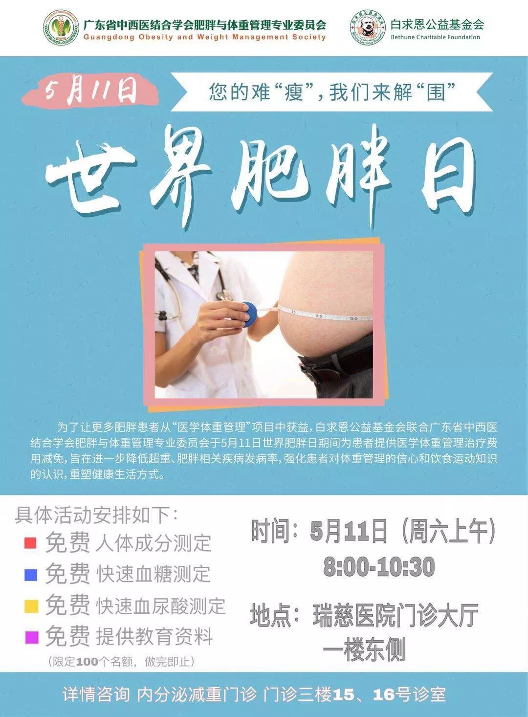為了讓更多肥胖患者從“醫(yī)學體重管理”項目中獲益,南通瑞慈醫(yī)院內(nèi)分泌科減重門診將于5月11日上午舉辦大型肥胖義診活動。