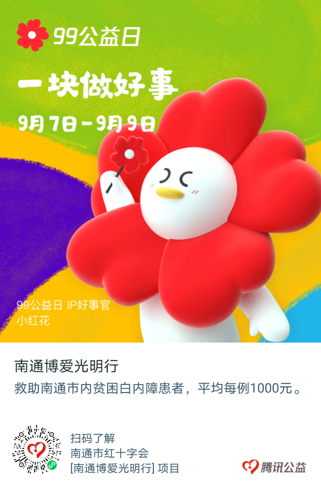 由騰訊公益發(fā)起的“99公益日活動”又來了,南通市紅十字會開展的“博愛光明行(南通)”項目火熱進(jìn)行中,9月7日至9日,“博愛光明行(南通)”項目將開展網(wǎng)絡(luò)籌款活動。捐款的人越多,此公益項目獲得的騰訊公益及紅十字會的相應(yīng)公益配額也越多,將使更多貧困患白內(nèi)障患者得到免費手術(shù)機(jī)會。