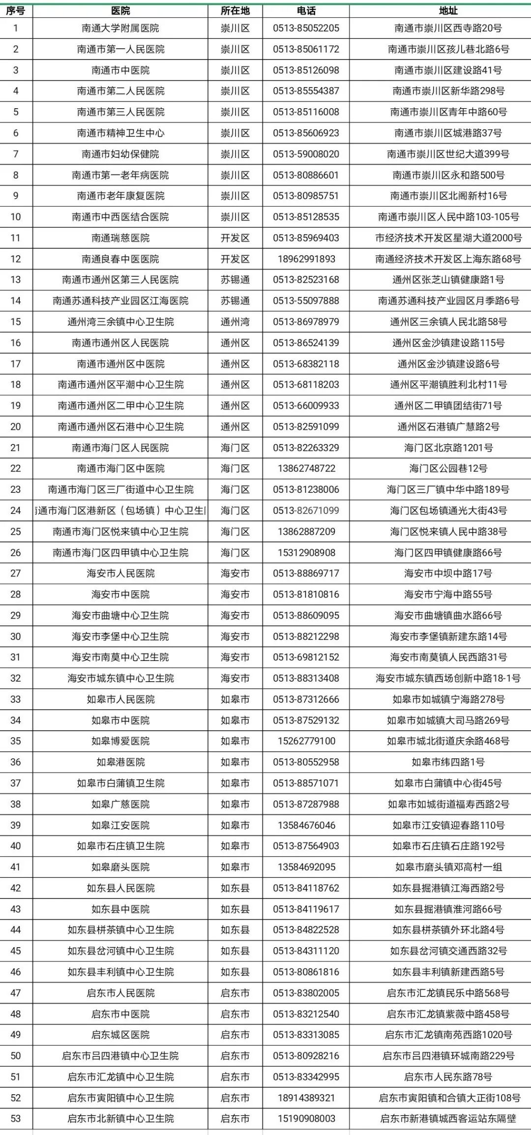 南通市53家設(shè)有發(fā)熱門(mén)診醫(yī)療機(jī)構(gòu)名單